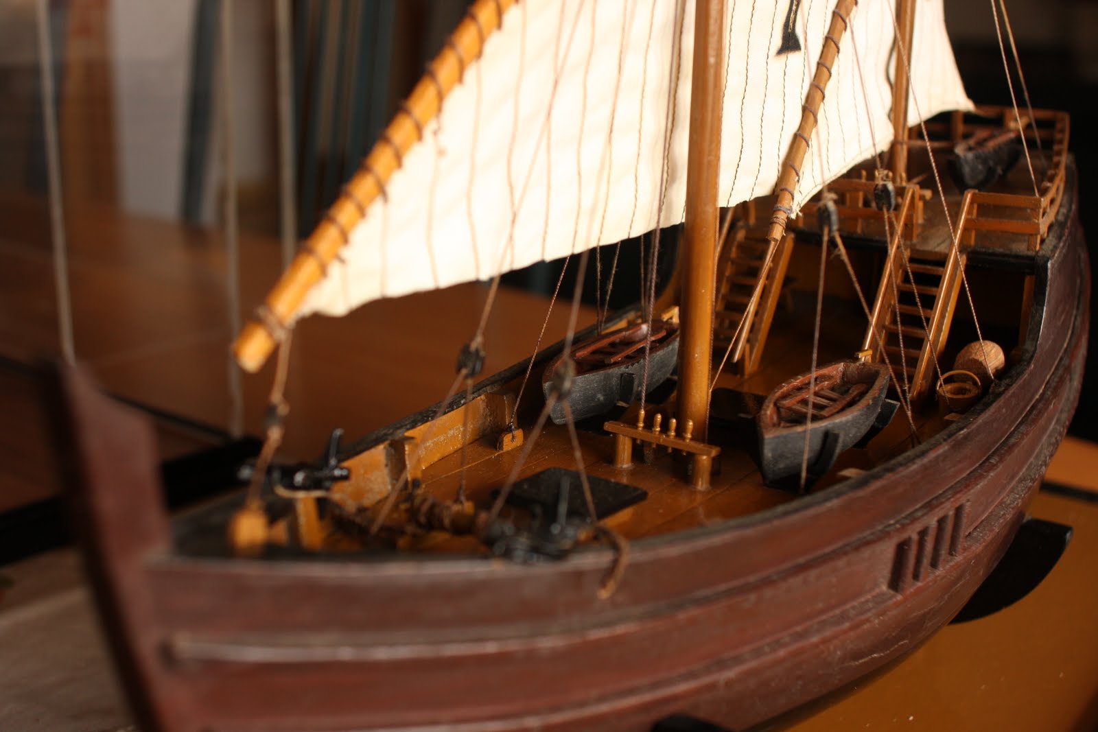 Este barco foi contruido pelo nosso processo normal; ir ao museu e comprar os desenhos do barco que gostariamos fazer, depois constroi-se as cavernas e a estrutura do casco com os restos de madeiras de outros trabalhos e por fim arames, cabos e imaginação para o convés...